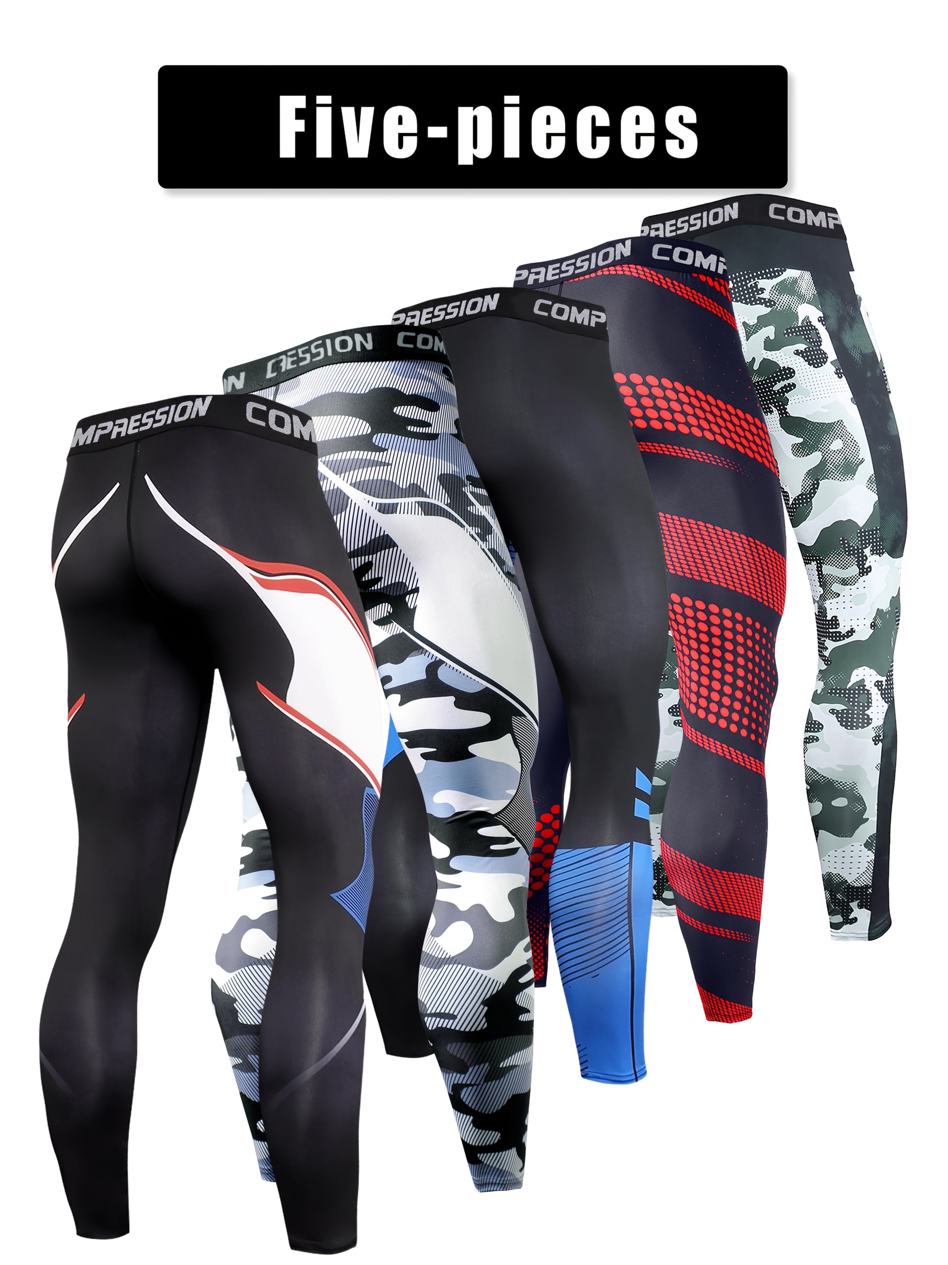 Random Print Patterns: Includes Black, Blue, Camouflage, and Red variations for a stylish workout look.
